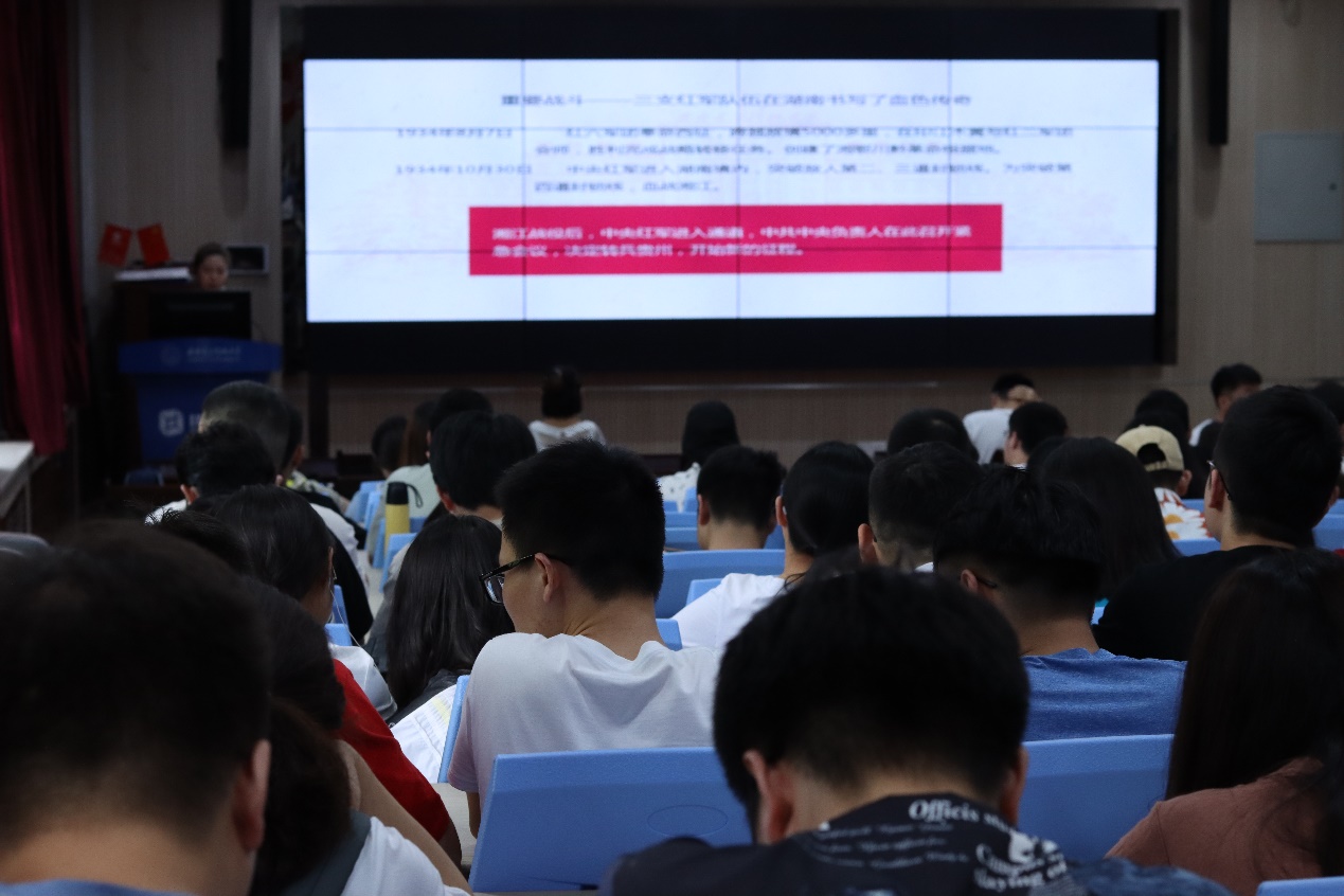 杜欣蔚的宣讲题目为《湖南对红军长征胜利的历史性贡献永载史册》,她通过“重要战斗”、“重大事件”、“众多将领”和“人民贡献”四个方面介绍了在红军长征的过程中,湖南地理位置所发挥的重要作用以及湖南人民做出的卓越历史贡献。