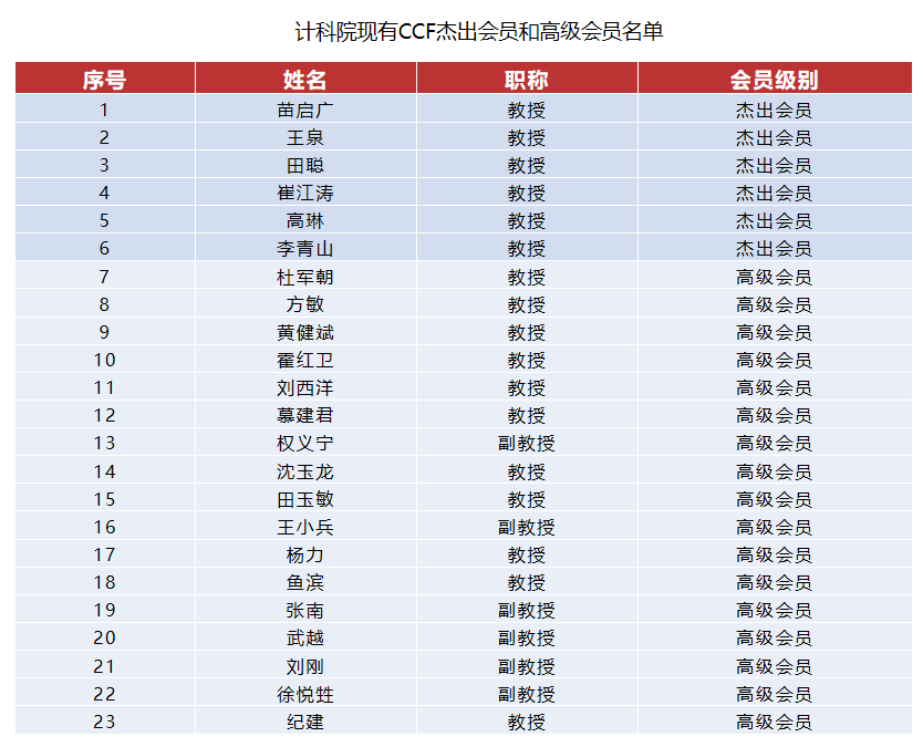 (通讯员 贠琳红 齐富)近日,中国计算机学会(CCF)2021年会员级别评审结果公布,110名CCF高级会员晋升杰出会员、351名CCF专业会员晋升高级会员。其中,公司教师高琳、李青山晋升杰出会员,刘刚、纪建、徐悦甡晋升高级会员。截至目前,公司共有6名CCF杰出会员,17名CCF高级会员。根据《CCF会员条例》,杰出会员、高级会员数分别约占专业会员数的10%和25%,能够获此殊荣是CCF对公司教师学术成就以及他们对CCF贡献和计算机专业发展的充分肯定,是一项很高的荣誉。