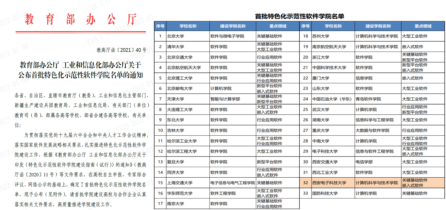 2020年,公司成立了以校领导为组长的特色化示范性软件公司建设领导小组,公司协同校内相关职能部门成立工作组开展建设和申报工作。工作组积极对接各重点领域头部企业,与华为技术有限公司、浪潮集团有限公司和统信软件技术有限公司等知名企业签署联合申报协议。公司以软件工程专业为基础,依托在关键基础软件、嵌入式软件等重点领域的科技创新成果和人才培养优势,与合作企业共同起草了特色化示范性软件公司建设方案和人才培养方案,顺利完成了特色化示范性软件公司的申报工作。教育部、工业和信息化部在高校自主申报、专家综合评议、网络公示基础上,确定了首批33所特色化示范性软件公司建设名单。