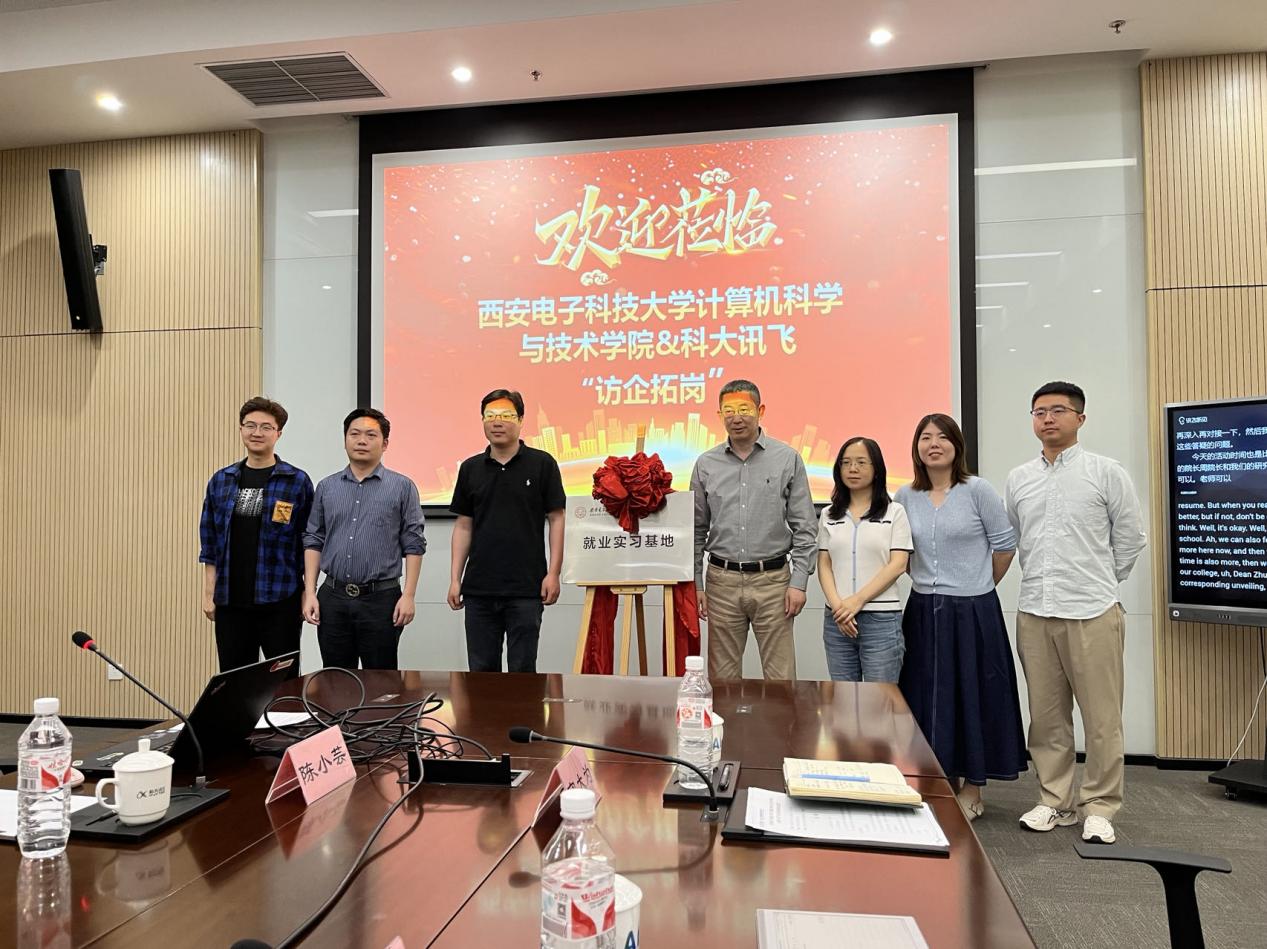 随后,科大讯飞高教行业对接、人力资源招聘相关负责人分别就讯飞产品生态和校园招聘、人才引进政策等方面做了详细介绍。就职于科大讯飞、公司2023届硕士毕业生齐海博分享了自己的求职心路历程和职场角色转化经验,并和研究生代表进行了现场交流。会议最后,崔江涛和来意哲代表双方共同为“就业实习基地”揭牌。