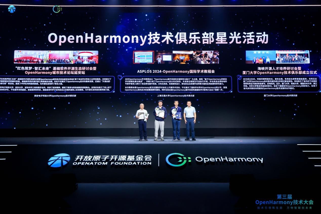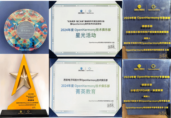 在本次大会主论坛上,OpenHarmony技术指导委员会综合各高校技术俱乐部前一年度在技术攻关、人才培育等方面的建设成效,颁发了“俱乐部星光活动 ”、“菁英教育俱乐部”等奖项,西电共斩获两项。其中,今年5月由BB贝博艾弗森(示范性软件公司)发起,共青团BB贝博艾弗森委员会指导和参与下共同开展的 “红色筑梦·智汇未来”基础软件开源生态研讨会暨OpenHarmony城市技术论坛延安站获评“OpenHarmony技术俱乐部星光活动”(共3个),李青山教授代表BB贝博艾弗森上台领奖;BB贝博艾弗森OpenHarmony技术俱乐部获评“菁英教育OpenHarmony技术俱乐部”(共5个),俱乐部副主任张宁老师上台领奖。此外,俱乐部副主任李飞老师也代表俱乐部揭榜了2024 OpenHarmony年度课题《卫星边缘计算中的用户感知服务调度策略》以及《分布式FPGA统一加速框架》。