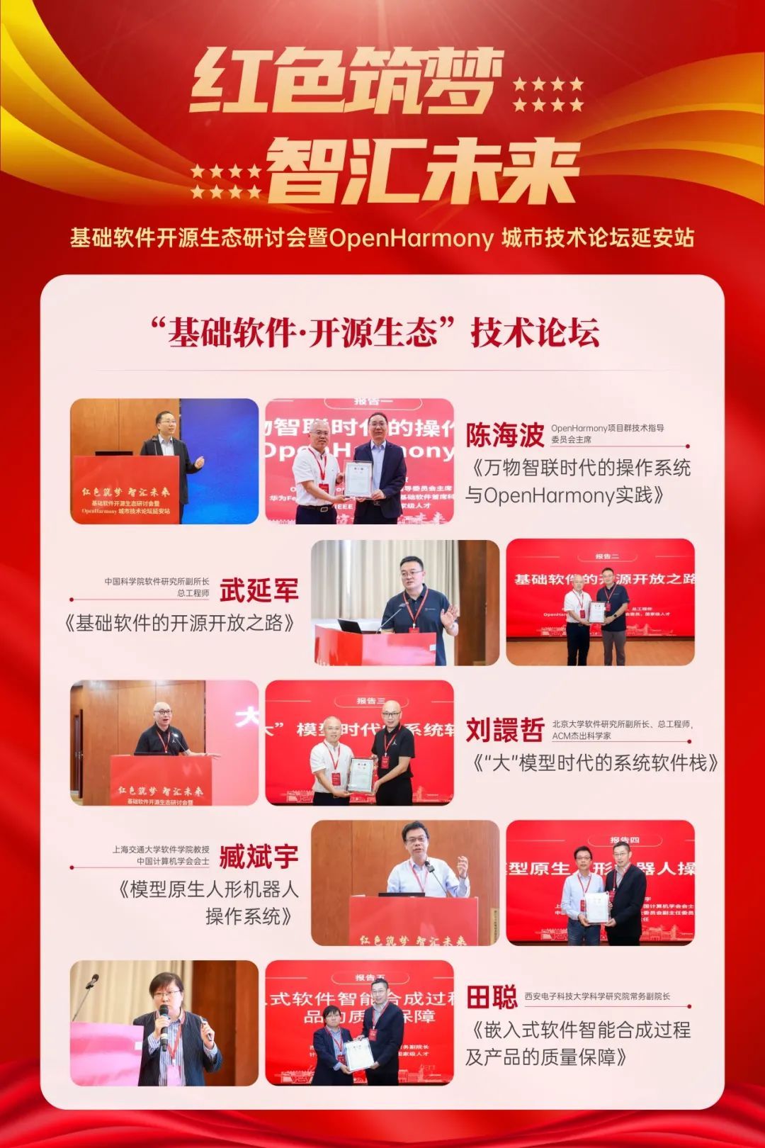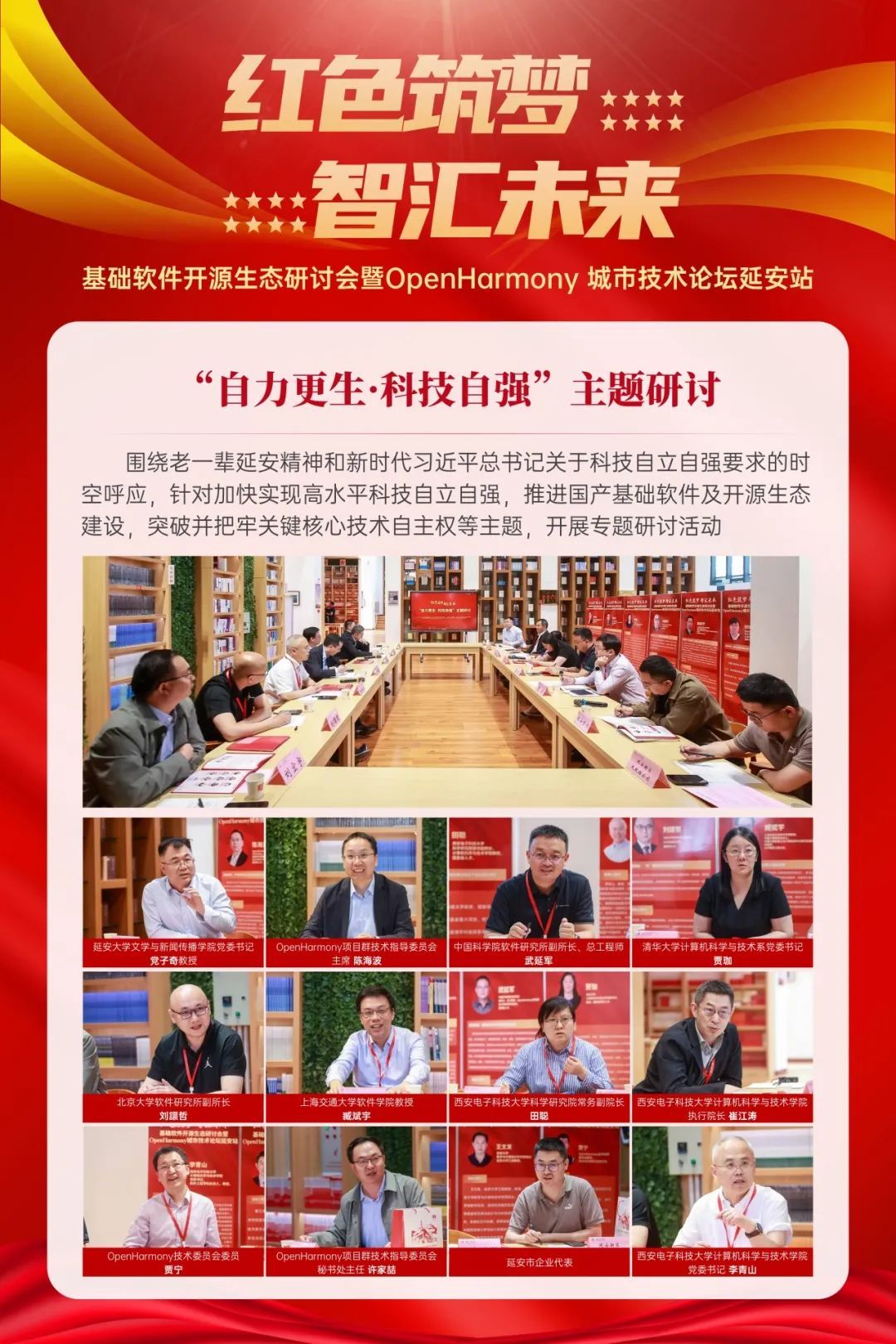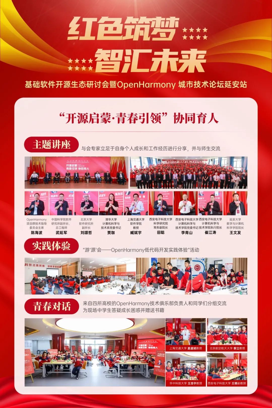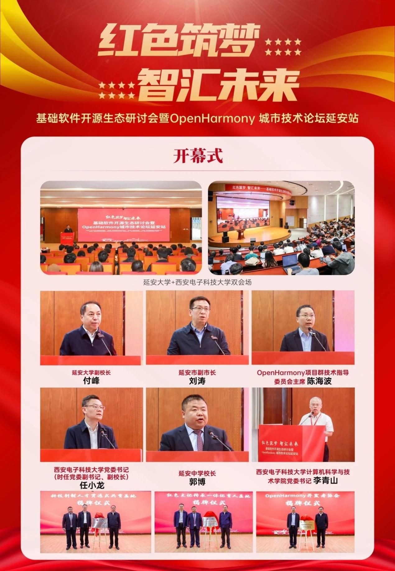 获得2024年“OpenHarmony技术俱乐部星光活动”奖项的“红色筑梦·智汇未来”基础软件开源生态研讨会暨OpenHarmony城市技术论坛延安站,由西电BB贝博艾弗森前期精心筹划和组织,为深入贯彻落实习近平总书记在中共中央政治局就加强基础研究进行第三次学习时的重要讲话精神,“要打好科技仪器设备、操作系统和基础软件国产化攻坚战”的重要部署,活动由西安和延安两地联动,BB贝博艾弗森、延安大学、延安中学、学习书院四会场协同,邀请了二十余名来自OpenHarmony项目群技术指导委员会、华为、中国科公司软件研究所、清华大学、北京大学、上海交通大学、北京航空航天大学、华中科技大学、BB贝博艾弗森等在基础软件和开源领域有代表性和影响力的学术界和产业界专家学者受邀参加活动,延安市副市长刘涛、BB贝博艾弗森党委书记(时任党委副书记、副董事长)任小龙、延安大学副董事长付峰、延安中学董事长郭博出席,千余名大中学师生参加线下多场活动,数万人线上聆听技术报告。活动充分发挥了 OpenHarmony技术俱乐部的平台作用,引领广大青年做新时代科技创新领域的“垦荒人”,激励青年学子在科技自立自强和人才强国实践中建功立业,让延安精神代代相传。