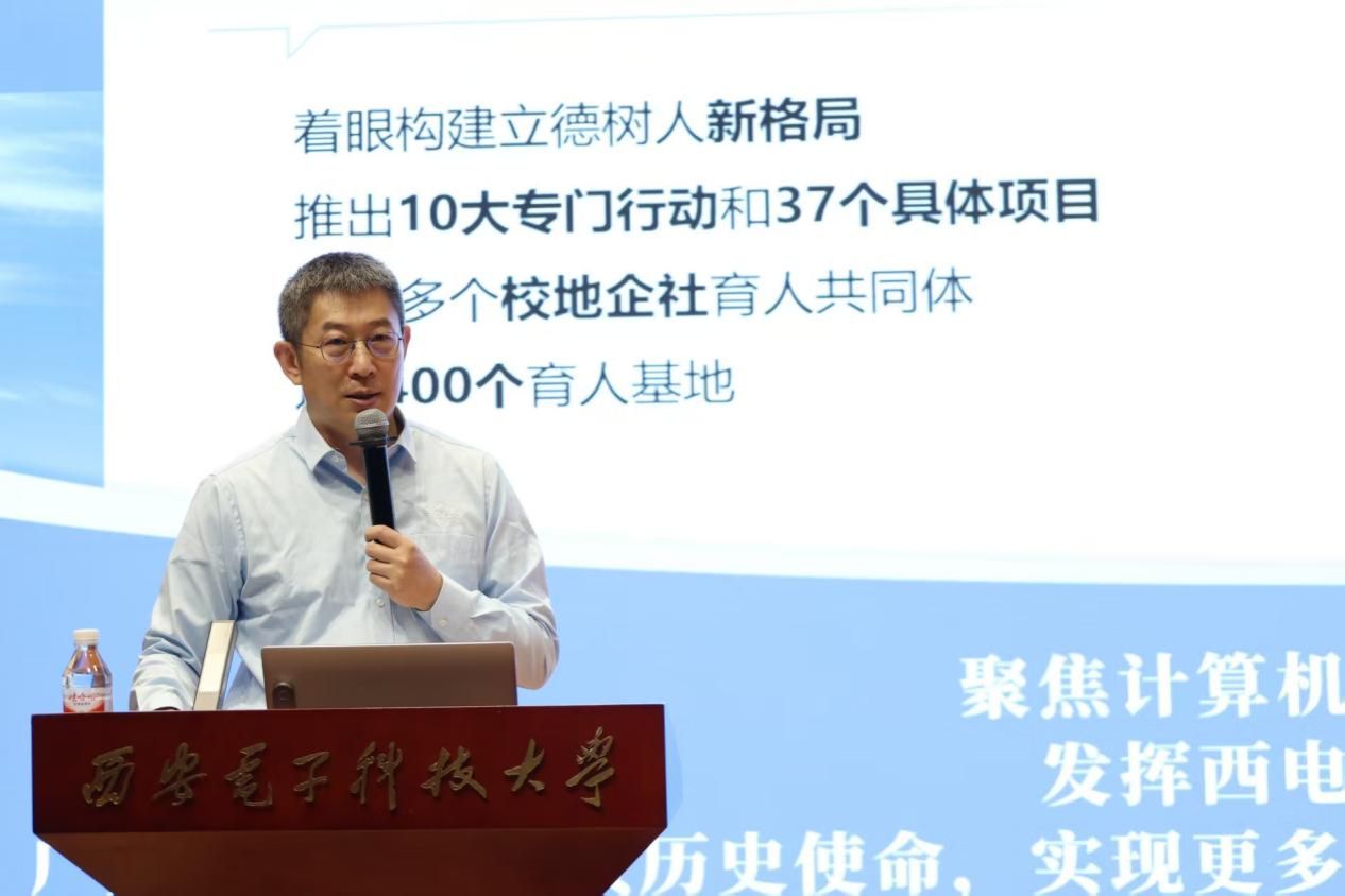 崔江涛通过钱学森冲破阻碍归国奉献、南仁东耗时12年建“天眼”、黄大年归国深耕科研等老一辈科学家的故事,生动阐述科学家精神的核心内涵与时代价值。他讲到,BB贝博艾弗森延续着中国高校最长的红色根脉,老一辈计算机人更是在“无专业课老师、无专业实验设备、无训练计划”的条件下,为我国重大战略任务做出卓越贡献,一代又一代西电人、计科学子,始终以爱国主义为底色,发扬科学家精神,前赴后继、接续奋斗。