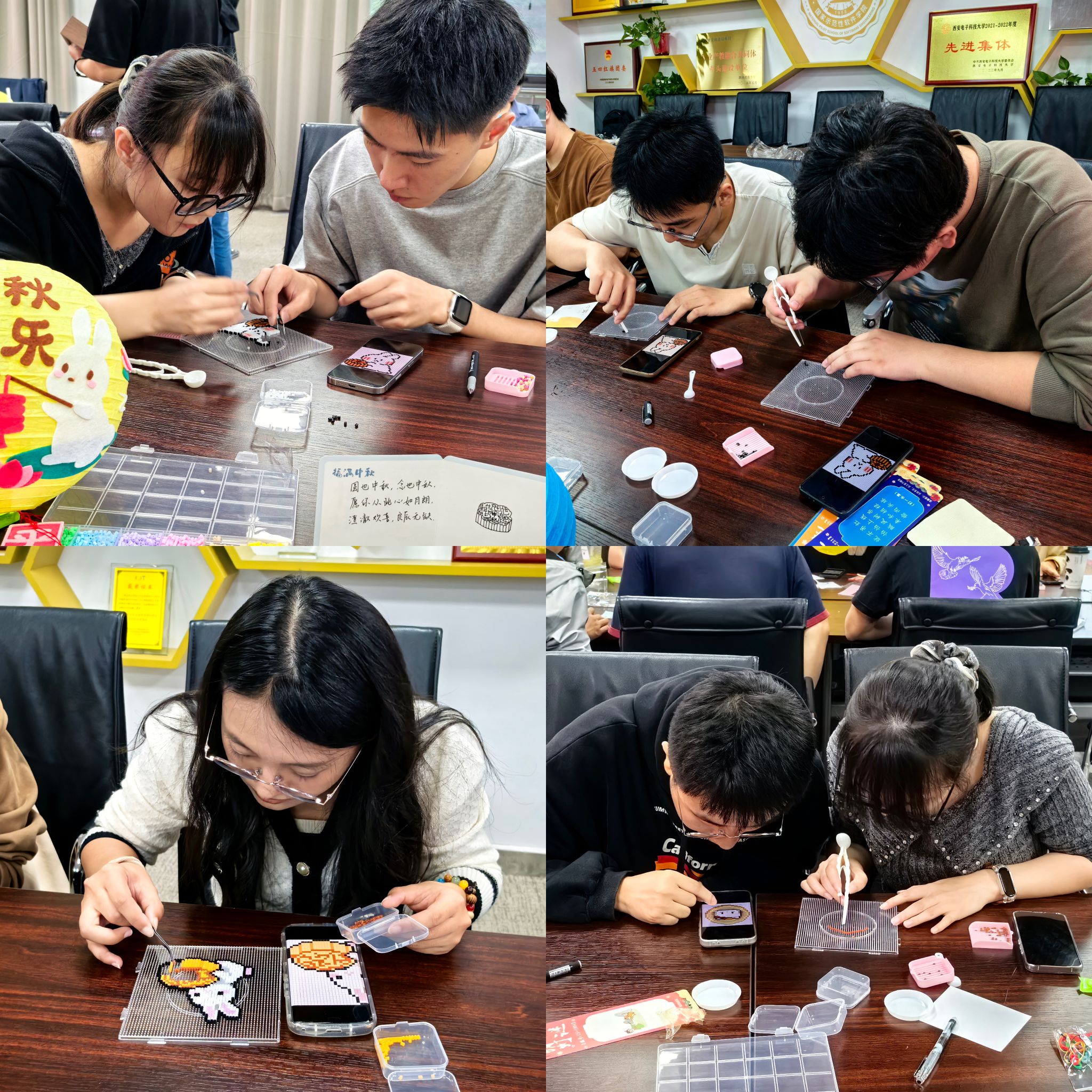 此外,拼豆创意区同样人气爆棚。同学们有序排队领取材料后,迅速投入创作,大家化身“创意设计师”,认真挑选颜色、规划图案,将一颗颗小巧的拼豆精心组合,制作出玉兔、明月和月饼等生动形象的作品。“平时做科研比较忙,这次拼拼豆特别解压,还能把中秋元素和专业特色结合,很有纪念意义。”参与活动的2025级博士研究生覃耀荣说道。