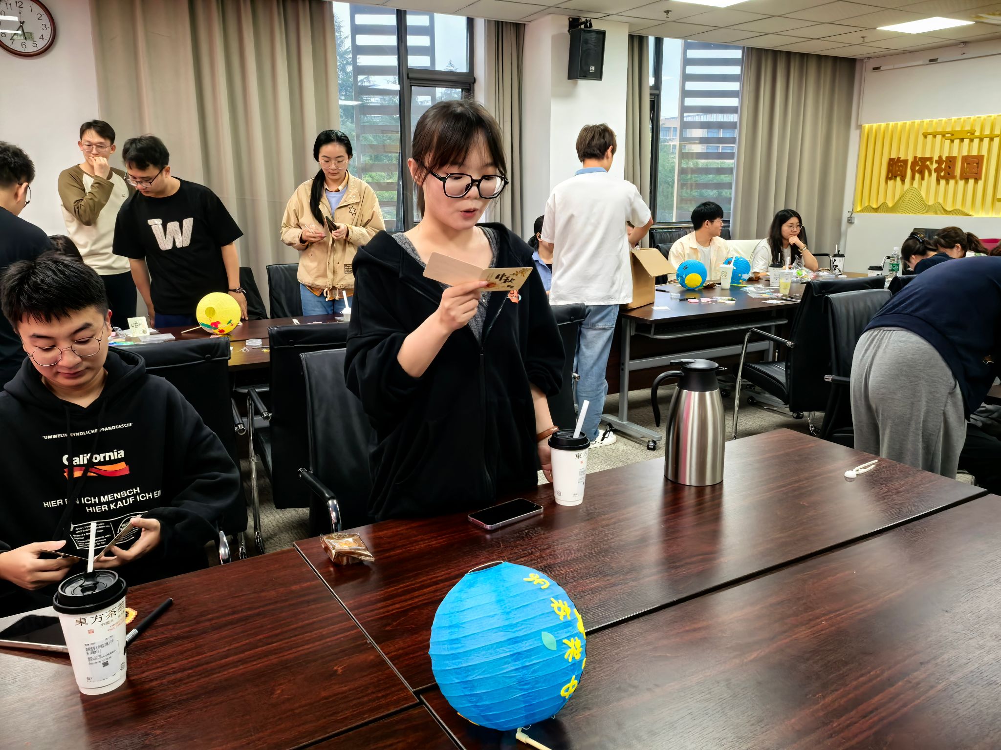 活动伊始,同学们在“祝福盲盒区”有序驻足,拿起笔在卡片上认真书写,有的结合科研日常,写下“科研顺利、中秋安康”的祝愿;有的聚焦亲情,写下“平安顺遂、常盼团圆”的牵挂;还有同学写下“愿温暖常伴,中秋快乐”的暖心祝福。写完后,大家将卡片对折,投入专属盲盒中,期待这份心意能被现场其他伙伴抽取。作为活动开场,不仅为同学们提供了表达心声的平台,也在轻松互动中拉近了彼此距离。