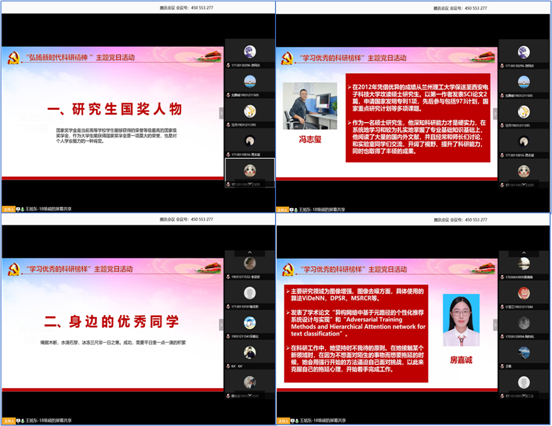 活动开始,青年委员王旭东首先为大家介绍了一些取得了优异成果的优秀研究生榜样及支部内的优秀党员榜样,带领大家学习他们的科研心得和精神,并表示员工党员更应该在学习科研中发挥带头作用,不忘初心,持之以恒,做好科研,做出表率,为建设科技创新型国家而努力。