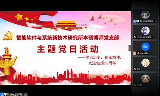 (通讯员 贺同庆)为庆祝建党99周年,重温党的光辉历史,传承弘扬革命先辈的奋斗精神,BB贝博艾弗森智能软件与系统新技术研究所本硕博师联合党支部于2020年7月1日召开了“牢记历史,传承精神——庆祝建党99周年”主题党日活动。本次活动由支部青年委员王旭东同志主持,活动共计39人参加,采用腾讯会议线上召开的方式进行。