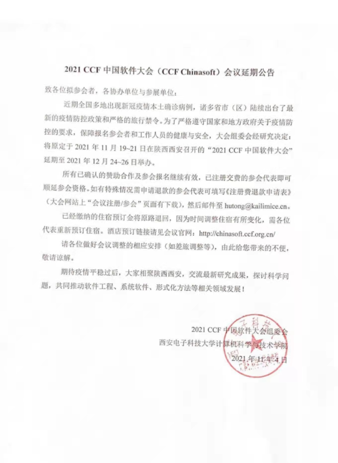 近期全国多地出现新冠疫情本土确诊病例,诸多省市(区)陆续出台了最新的疫情防控政策和严格的旅行禁令。为了严格遵守国家和地方政府关于疫情防控的要求,保障报名参会者和工作人员的健康与安全,大会组委会经研究决定:将原定于2021年11月19-21日在陕西西安召开的“2021 CCF中国软件大会”延期至2021年12月24-26日举办,举办地点仍为陕西省西安市高新国际会议中心。