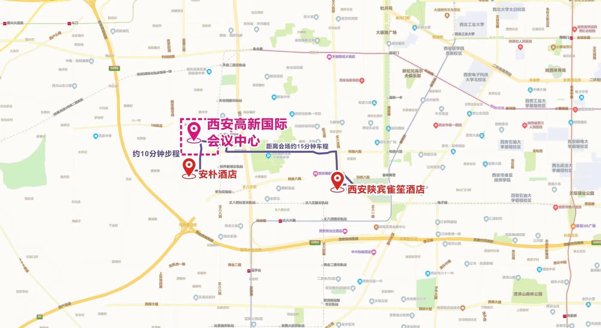 本次大会选取西安高新国际会议中心附近的酒店作为各参会代表的住宿酒店。住宿酒店(除西安安朴酒店外)组委会将安排大巴车统一接送。西安安朴酒店距西安市高新国际会议中心较近,约5分钟车程,步行约15分钟。酒店预订链接:http://kaili.kailimice.cn/f/WuTdwF