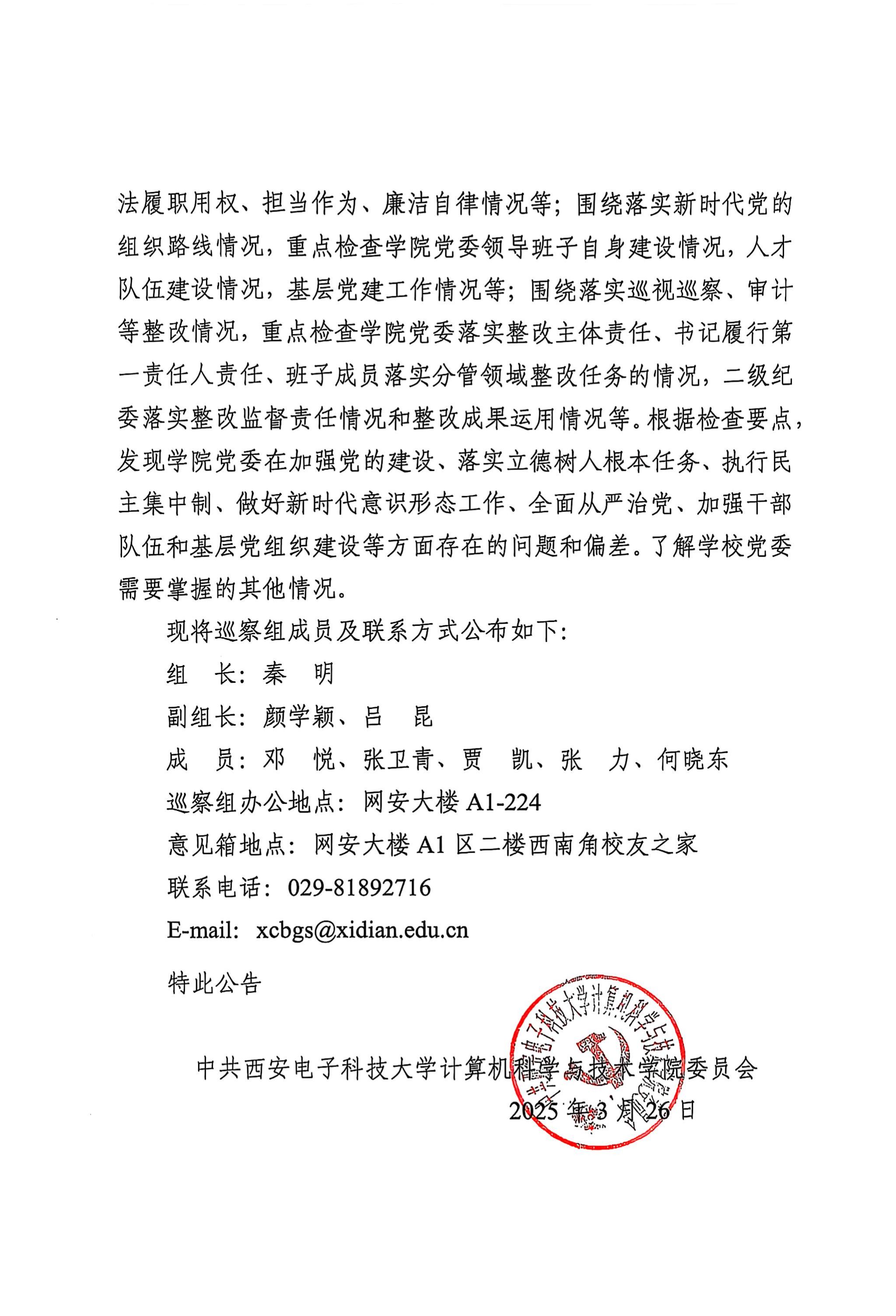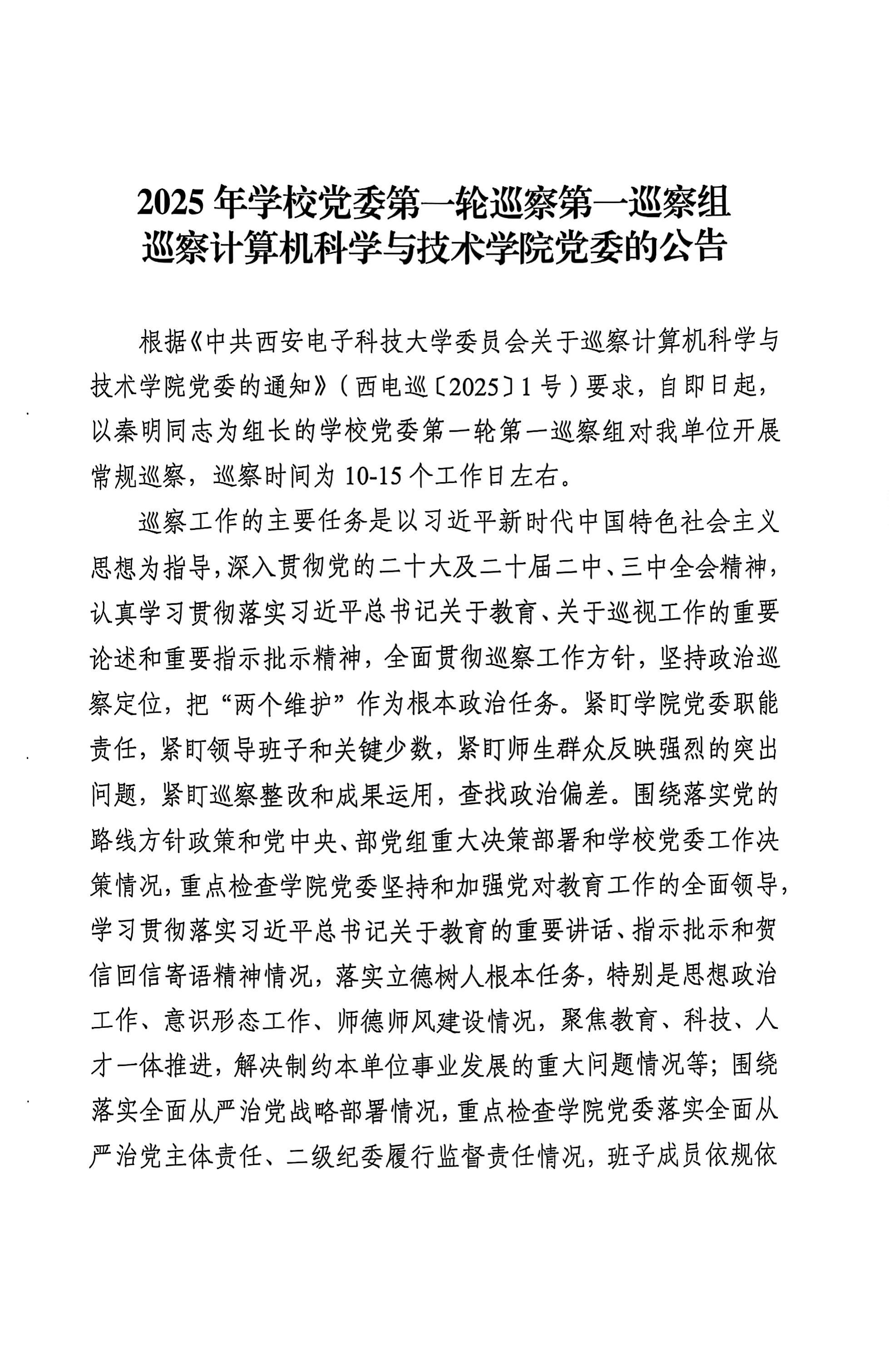 2025年公司党委第一轮巡察第一巡察组巡察计算机科学与技术公司党委的公告