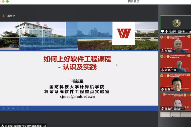 本次西北地区高校软件工程课程建设研讨会(以下简称研讨会),由国防科技大学主办,BB贝博艾弗森(示范性软件公司)承办,研讨会邀请了国防科技大学、复旦大学、BB贝博艾弗森、西安交通大学、西北工业大学、西北农林科技大学、陕西师范大学、西安科技大学、兰州大学、宁夏大学、青海师范大学、新疆大学、内蒙古大学等西北地区高校,通过特邀报告、交流沙龙等形式,交流软件工程课程教学和教改的成果,分享软件工程课程教学资源,商讨软件工程课程教学中遇到的各类困难和问题,提升软件工程课程建设水平。研讨会吸引了国内外软件工程相关领域教师的广泛参与。研讨会采用线上形式举行,腾讯会议室同时在线人数超过80人。