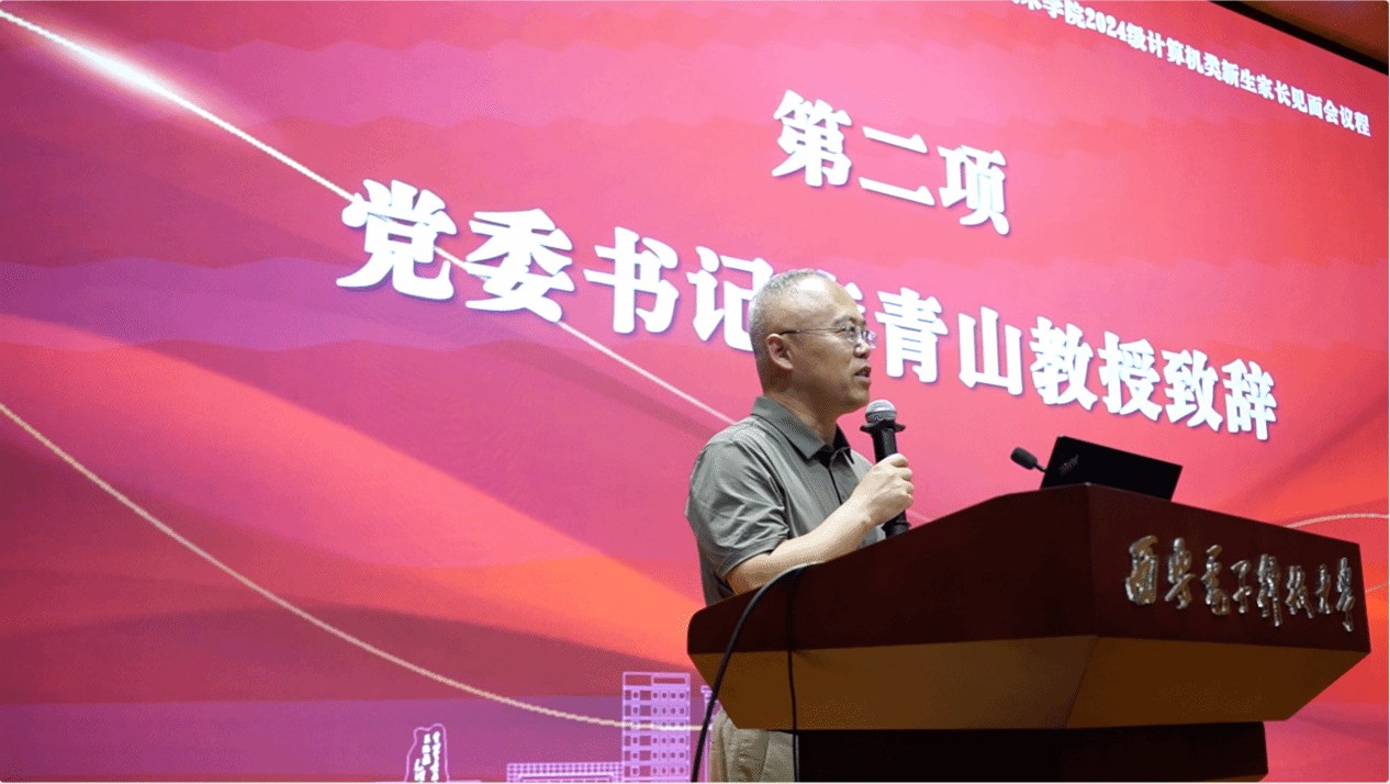 随后,公司党委书记李青山教授致辞。李青山的致辞围绕“欢迎、自豪、传承、共育”四个方面展开。首先,他以西电的红色基因和电子信息特色为引,对各位家长将孩子们送到西电、送到BB贝博艾弗森表示欢迎;其次,他结合公司的历史地位和现实成就,表示家长们应为孩子们加入BB贝博艾弗森大家庭而感到自豪;然后,他对建院六十余年凝练出的“三系精神”内涵和“严谨、担当、勤勉、开放”的院训进行解读,并希望在座的各位家长们能够在未来感受到这份精神传承对孩子们的积极影响;最后,希望在个人、公司、家庭、社会的协同共育下,帮助员工成长为德才兼备、身心健康的计科人,做“三系”精神的传承者,勇担时代重任,在实现中华民族伟大复兴的时代洪流中踔厉奋发、勇毅前进,奋力书写属于他们的人生篇章。