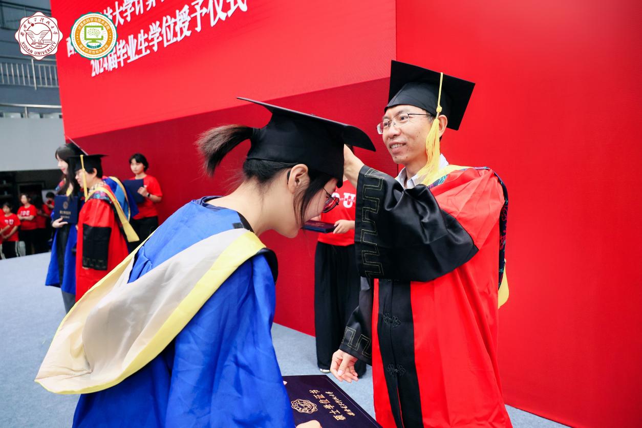 伴随着激扬、欢快的音乐,毕业生们整理好学位服、学位帽,排着整齐的队伍依次上台,向授位嘉宾鞠躬致敬,授位嘉宾一一为同学们拨穗、授位,并留下了宝贵的合影。与会领导、老师,全体毕业生共同见证这神圣而庄严的时刻。