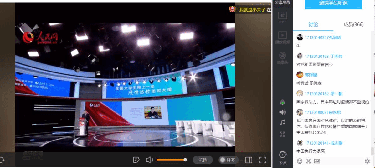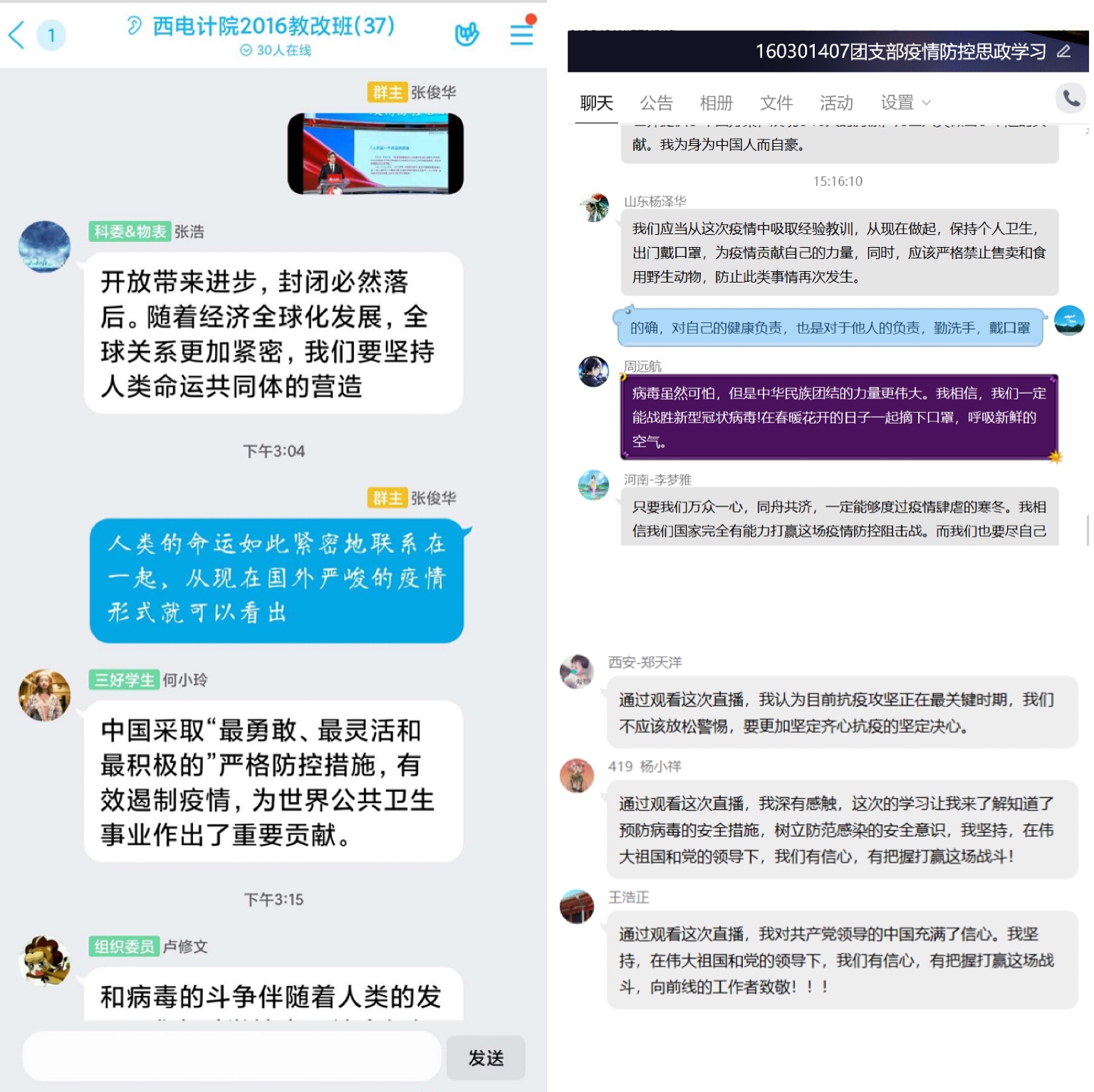 本科2017级辅导员组织员工工作骨干通过腾讯会议一同观看直播,课后一起进行了总结和研讨。班团骨干们分别汇报了各班组织线上学习的情况,分享了心得感受。辅导员张志为在课后感慨道:“在这场没有硝烟的人民战争中,包括我们西电学子在内的广大青年,用自己的行动和方式,向我们展示了他们的可爱、可靠、可期,经历过这场疫情,他们也会更快地成长、成熟、成才。今天的‘思政大课’内容充实、形式生动、反响热烈,我相信同学们将会以更加积极的姿态投入到抗击疫情的战斗中,必将以更加自信的行动投入到实现中国梦的奋斗中。”