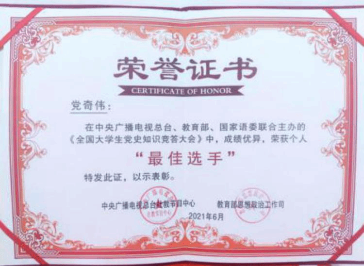 (通讯员 同榛)百年恰风华,世纪正青春。2021年6月,中央广播电视总台联合中央党史和文献研究院、教育部、国家语言文字工作委员会、共青团中央宣传部、全国学联秘书处等部门联合打造《全国老员工党史知识竞答大会》,在全国特别是老员工群体中掀起了党史学习的热潮。近日,大会传来佳讯,公司在全国2800多所参赛高校中脱颖而出,荣获团队二等奖(西北地区高校最好等次)。公司2017级计算机科学与技术专业本科生、第23届研究生支教团成员党奇伟同学,荣获个人“最佳选手”。