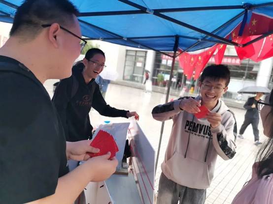 “社会主义制度在中国确立的标志?”“中国特色社会主义理论体系的内容?”“中国梦的基本内涵?”…新中国成立史知识竞赛专区,一面面小国旗的背后是同学们精心准备的新中国发展历史相关的问题,现场参与活动的同学们热情高涨,积极踊跃,在参与活动的过程中扩展了新中国史相关知识。