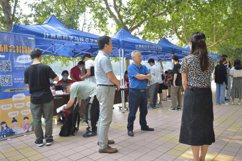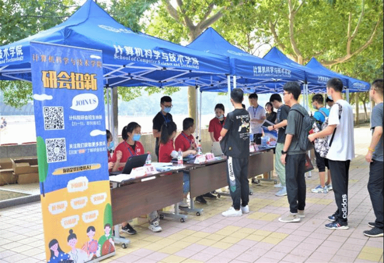 9月13日,北校区主楼下步行街研究生报到接待点,迎新志愿者们早早就开始了准备工作,搭设帐篷、摆放桌椅、分配物资。研究生迎新现场设立了六个工作台,志愿者分工合作,服务不同班级的新生,检查报道材料、登记信息、发放物资、一卡通、介绍校园、组建班群等等,各项工作井然有序。