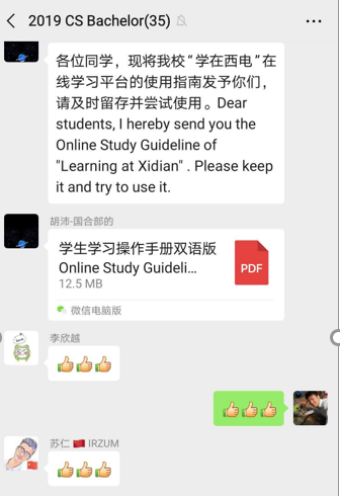 全面梳理,重点关注。目前计算机科学与技术专业2019级职工共有24人,分布在9个国家,面对疫情特殊时期以及职工回国问题,会同国合部第一时间发送了线上学习情况的调查问卷,调研员工们所处的位置状态、进行线上学习的设备情况以及员工所处地区的时差等问题。获知8个员工在国外的消息后,仔细询问每个员工的情况,了解他们的想法,打消他们的担忧。建立全体任课教师和职工的微信群,提前公布中英文课表,发布学在西电平台使用手册英文版,及时解答员工提出的各类问题。