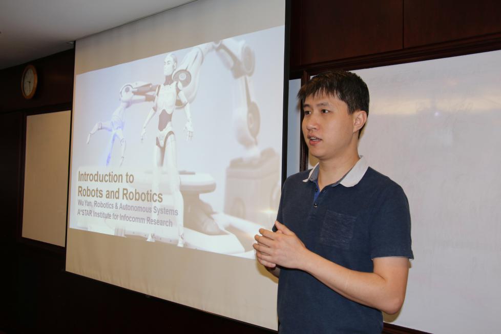 24日上午,新加坡国立大学著名教授Dr. Marcelo Ang带领同学们一起,对未来的机器人进行展望。Dr. Marcelo Ang就机器人的发展过程,指出机器人的发展目标是研发以人为本的智能机器人。为了帮助同学们更好地理解,教授以无人驾驶机器人为例,深入浅出地介绍了智能机器人应有的特性。