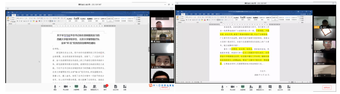 (通讯员 刘泽宇 孙煊溢)新冠肺炎疫情爆发以来,广大医护工作者、奋斗在疫情防控各条战线上的工作者披荆斩棘、勇挑重担,为坚持打赢疫情防控总体战不遗余力。3月15日,习近平总书记给在首钢医院实习的西藏大学医公司员工、北京大学援鄂医疗队全体“90后”党员回信,向他们和奋斗在疫情防控各条战线上的广大青年,致以诚挚的问候。回信在广大青年员工,特别是员工党员中引起热烈反响。4月3日晚上7点30分,BB贝博艾弗森硕士031712班第一、二党支部通过线上会议方式举办了“青年不惧风雨、抗疫勇挑重担”主题党日活动,认真学习习近平总书记回信精神,并开展热烈讨论。