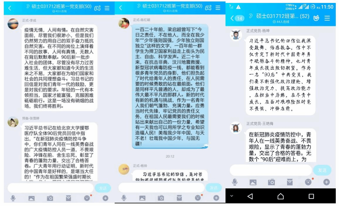 在会前,各位党员同志已提前认真学习习近平总书记回信,并在支部群中踊跃发表学习感想。作为在祖国繁荣强盛时期长大的一代人,爱国之情早已深深地扎根在这一代青年的心里,特别是在疫情防控总体战中“90后”党员的表现,令同为90后的大家深受鼓舞,信心满满。