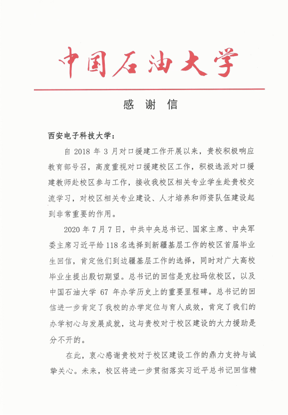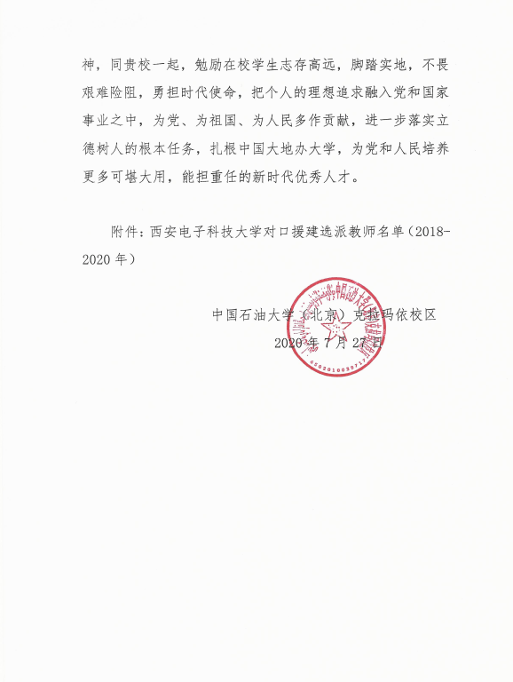(通讯员 陈龙)为响应教育部号召,对口援建中国石油大学(北京)克拉玛依分校,2018年9月,BB贝博艾弗森选派教学科研经验丰富的牛海军教授前往中国石油大学(北京)克拉玛依分校援建三年,牛海军教授勇于担当、甘于奉献,在援建期间,工作兢兢业业、任劳任怨、无私奉献,开展了大量卓有成效的工作,得到了公司领导、同事和员工们的认可。中国石油大学(北京)克拉玛依分校为表达感谢,专门致电公司,对公司及牛海军教授表示感谢。