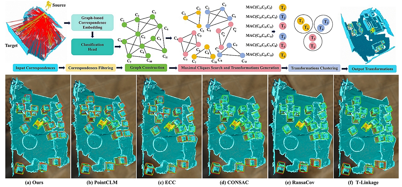 该论文针对多实例点云配准模型在应用全局空间一致性时存在固有的模糊性,以及其在处理重叠实例问题上的明显不足,提出一种基于极大团的多实例点云配准模型。通过引入一种基于图的局部空间一致性方法衡量局部区域内点对应之间的几何兼容性,增强模型对离群点对应的过滤,以有效预估重叠实例的全部位姿。与此同时,通过在点对应兼容性图上搜索极大团来同时估计多个变换位姿,并将这些变换位姿聚类到对应不同实例的集合中,以精确估计所有刚性变换。