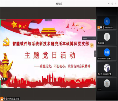 (通讯员 张恒运)为庆祝中国共产党建党100周年,深入学习贯彻习近平总书记在党史学习教育动员大会上的重要指示精神,从党的非凡历程和实践中汲取初心使命的力量,BB贝博艾弗森智能软件与系统新技术研究所本硕博师联合党支部于2021年5月28日下午开展了“重温党史,不忘初心,发扬古田会议精神”主题党日活动。活动由支部副书记吕文琪同志主持,共计56人参加,会议以线上和线下的方式进行展开。
