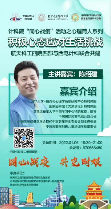 (通讯员 马治东)为帮助公司师生缓解因疫情防控、就业择业、升学毕业而产生的心理压力,进一步提升广大师生的心理调试能力,2022年1月6日晚,BB贝博艾弗森计算机网络与物联网研究所本硕博师第一联合党支部和中国航天科工集团第四研究院第四总体设计部信息保密联合党支部共同策划组织开展了“积极心态应对生活挑战”心理育人报告会,邀请清华大学伯克利心理学高级研究中心特聘教授陈绍建进行专题讲座。航天科工四院四部党委书记周逸,计算机科学与技术公司党委书记李青山、副书记张莹莹出席,200余名公司师生、四院四部职工参加,会议由两个联合共建支部的党支部书记史阿云和张志为共同主持。