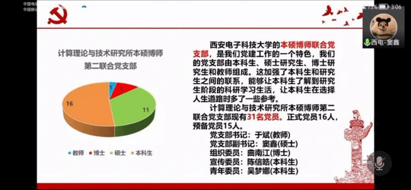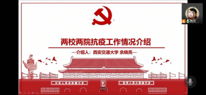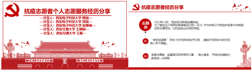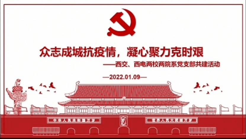 然后,西电的甘瑜嘉和西交的佘晓亮分别介绍了两校两院系党支部的抗疫工作情况。西安疫情当前,各高校均采取了严格有效的措施,西电BB贝博艾弗森计算理论与技术研究所本硕博师第二联合党支部迅速响应公司和公司党委号召,多名支部党员、入党积极分子加入公司志愿队,担任核酸检测志愿者、出入证志愿者等,以实际行动为同学们服务。西交南洋书院师生联合第三党支部快速响应,迅速发布了有关疫情防控的倡议书,组建书院抗疫志愿先锋队,组织“出入证志愿者、食堂志愿者、核酸检测志愿者”志愿服务队,公司老师、辅导员坚守一线,积极参与,为疫情防控做出贡献!