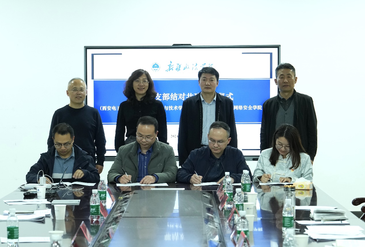 新政信息网络安全公司教师党支部与西电BB贝博艾弗森计算机科学系党支部、实践教学中心党支部、辅导员党支部现场签署结对共建协议。两院四支部将以共建为起点,积极发挥组织育人功能,加强沟通联系和资源共享,共同推进支部党建和育人工作双促进。