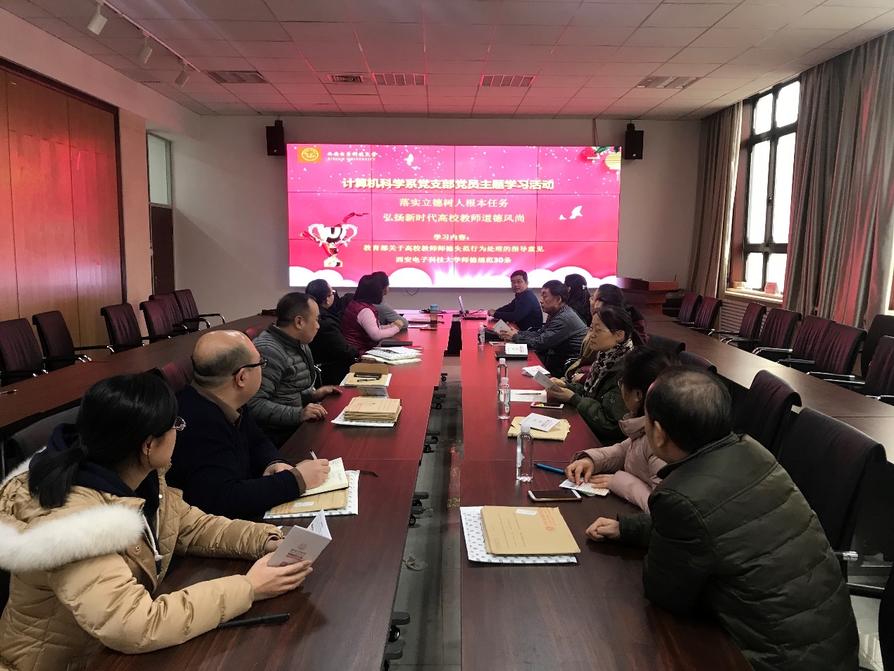 (通讯员 王晓丽,同榛)2018年12月25日下午,BB贝博艾弗森计算机科学系党支部在北校区主楼二区319会议室召开以“落实立德树人根本任务、弘扬新时代高校教师道德风尚”为主题的学习活动,深入学习了《新时代高校教师职业行为十项准则》、《教育部关于高校教师师德失范行为处理的指导意见》和《BB贝博艾弗森师德规范30条》。计算机科学系全体党员参加,会议由计算机科学系党委书记戚玉涛同志主持。