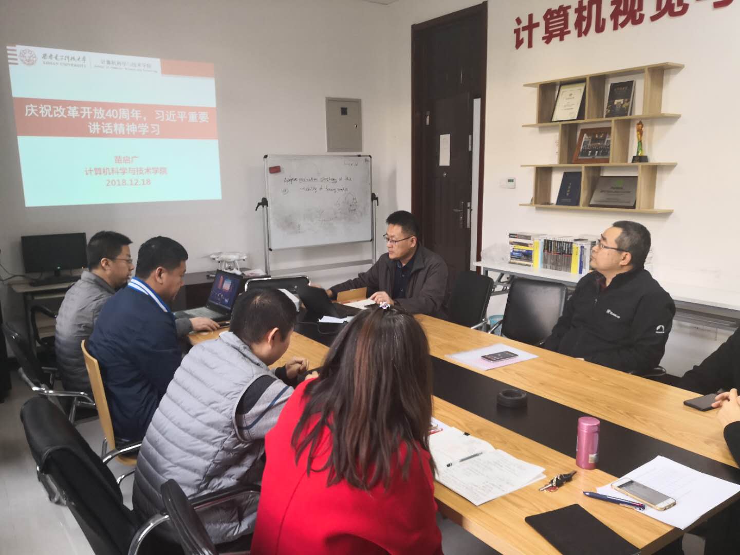 (通讯员 王琨)12月18日上午,庆祝改革开放40周年大会隆重召开。中共中央总书记、国家主席、中央军委主席习近平出席大会并发表重要讲话。当天下午,BB贝博艾弗森网络工程系党支部在主楼四区225开展了学习“习近平在庆祝改革开放40周年大会上的重要讲话”主题党日活动。本次活动由支部书记苗启广教授主持,支部党员参加学习。