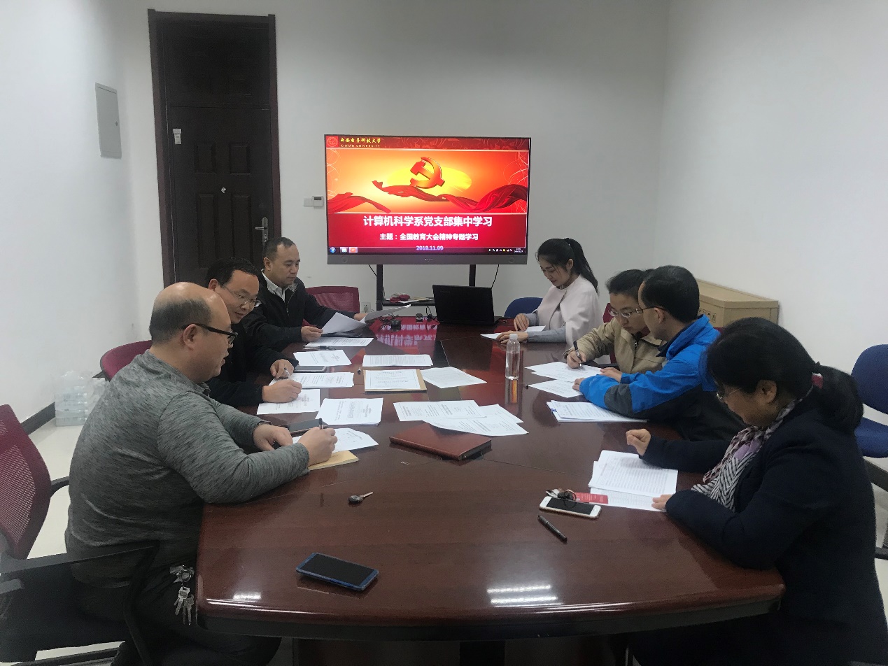 (通讯员:王晓丽)9月14日教育部党组下发《关于认真学习贯彻全国教育大学精神的通知》,要求各省、自治区、直辖市党委教育工作部门、教育厅(教委),新疆生产建设兵团教育局,有关部门(单位)教育司(局),部署各高等公司、部省合建各高等公司党委认真做好学习贯彻全国教育大会精神各项工作。为此,计算机科学与技术公司党委积极响应、统一部署,计算机科学系党支部认真筹划安排,结合公司2018-2020年专业技术岗位聘任工作实施方案和教学改革,于11月9日下午主楼IV区209会议室开展学习全国教育大会精神主题活动。本次活动由科学系党支部副书记王小兵同志主持。
