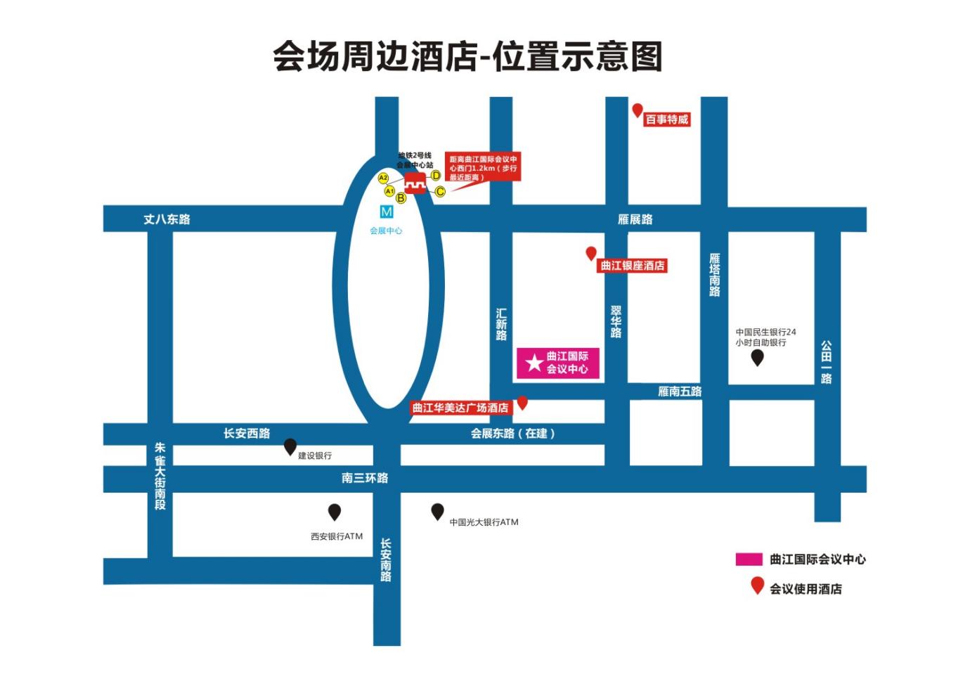 2)公共交通:机场(T1/T2/T3)乘坐地铁14号线(贺韶方向)乘坐8站--到达北客站(北广场)同站换乘地铁4号线(航天城方向)乘坐5站--到达行政中心地铁站同站换乘地铁2号线(韦曲南方向)乘坐13站--到达会展中心站C口东南口出站步行1.1公里到达曲江国际会议中心,全程约1小时50分钟。