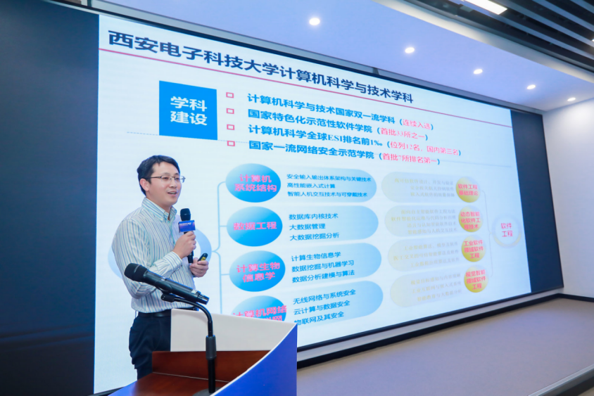 随后,沈玉龙教授与参会企业共同分享了《计算机技术前沿发展趋势》主题报告,并进行了开放应用场景的“揭榜挂帅”,从计算机科学与技术和软件工程两大学科,详细讲解了西电BB贝博艾弗森科学研究内容和技术应用场景。