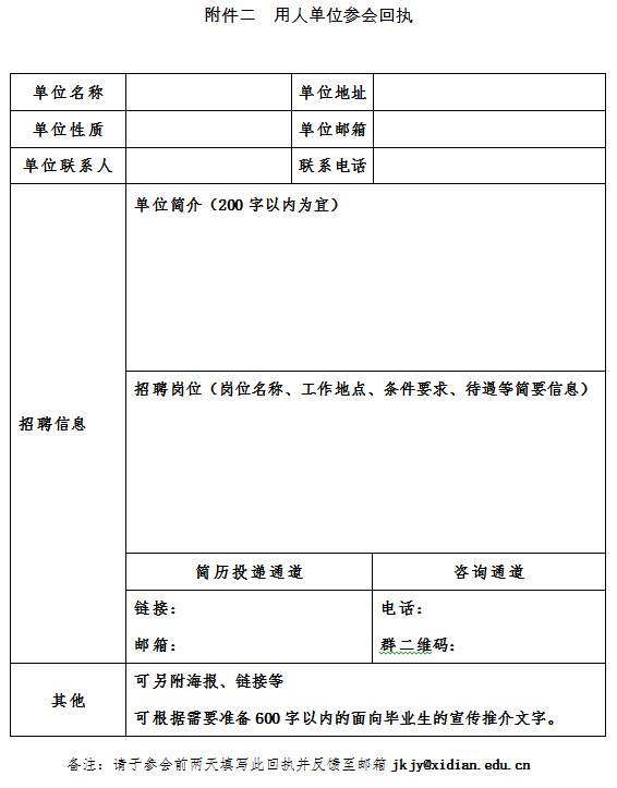 规范填写参会回执,见附件二,包括单位简介、招聘岗位及条件、待遇、简历投递及咨询通道等,反馈至邮箱即可报名。
