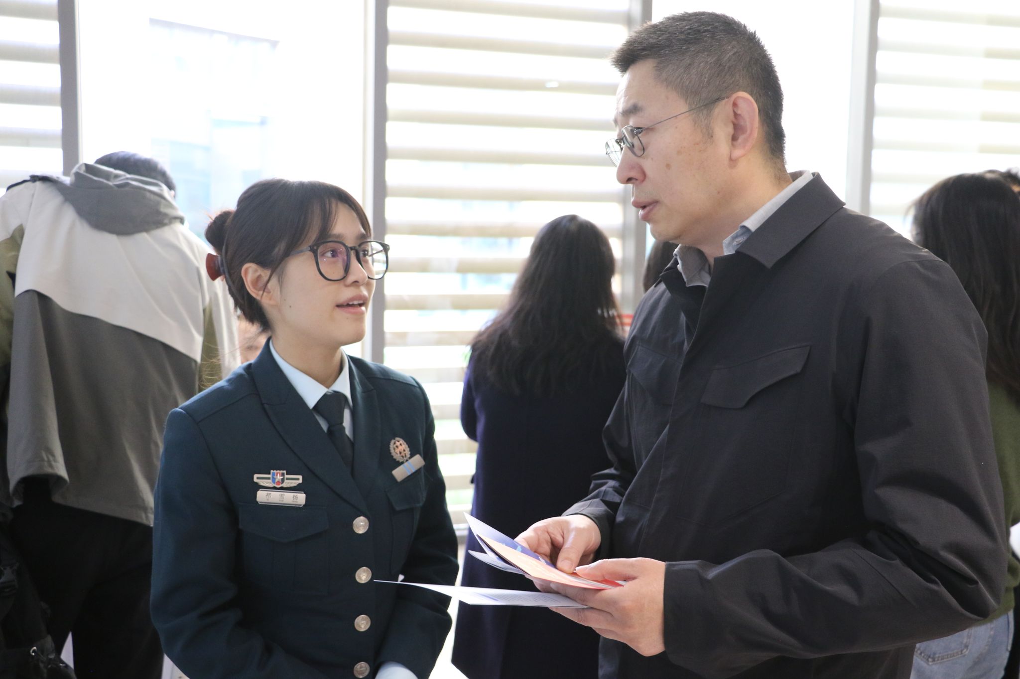 双选会期间,公司领导来到现场,与参会单位和求职毕业生亲切交谈,了解同学们的就业进展,听取用人单位的意见和建议。